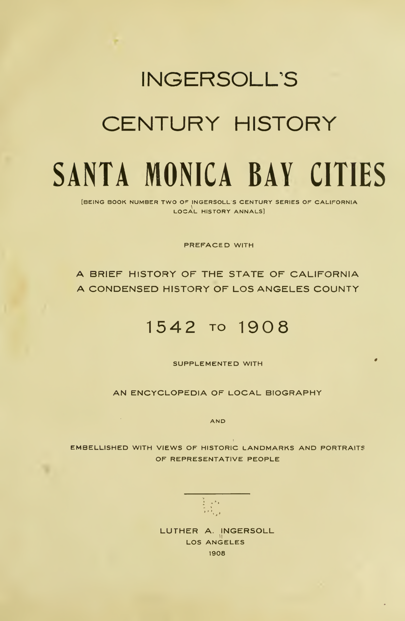 Ingersoll's Century History, Santa Monica Bay Cities 1542-1908 by Luther A. Ingersoll. Pgs 11, 17, 366-378.